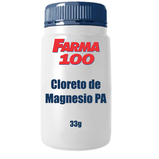 Cloreto de Magnésio PA em pó, indicado para preparo conforme orientação, acondicionado em embalagem com 33g.